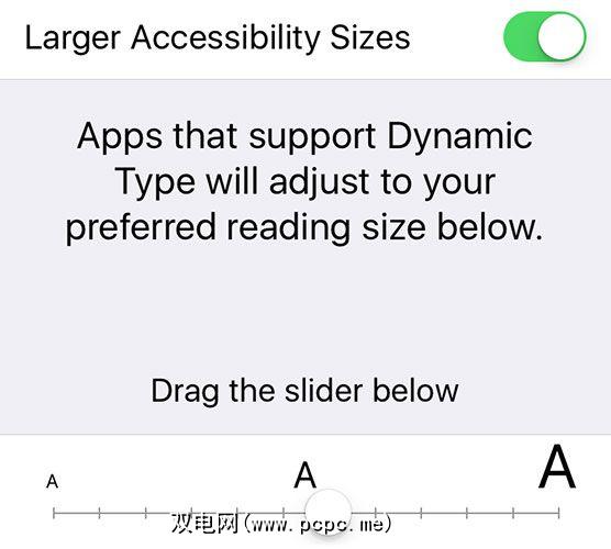 顺便说一句,您也可以使用此选项缩小文本,以防万一您希望在屏幕上显示更多文字。拖动滑块以调整文本大小,或使用较大的辅助功能大小选项在支持该功能的应用中启用更大的文本。