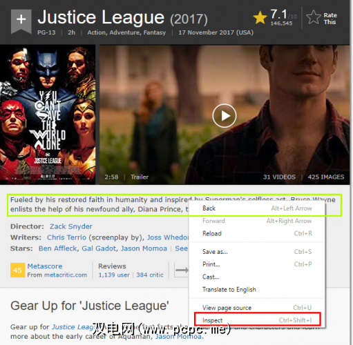 打开Google Chrome浏览器并导航至页面,例如正义联盟(2017)的IMDb页面。