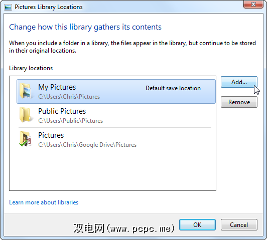 单击添加按钮可将其他文件夹添加到库中。该库将显示您添加的所有文件夹中的内容。例如,如果您的计算机中有多个硬盘驱动器,每个硬盘驱动器中都有一个装有视频文件的文件夹,则可以将它们全部添加到“视频"库中并在一个位置查看所有视频。如果将文档或图片存储在Dropbox Google云端硬盘中,则可以添加该文件夹并在同一位置查看所有类似类型的文件。