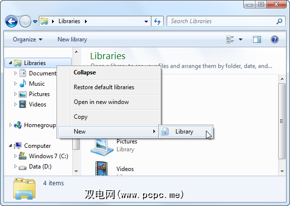 可以随意尝试使用库。如果您对库进行了太多更改,则始终可以右键单击Windows资源管理器侧栏中的“库"标题,然后选择“还原默认库"。 (如果禁用它们,则可以运行还原脚本。)