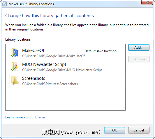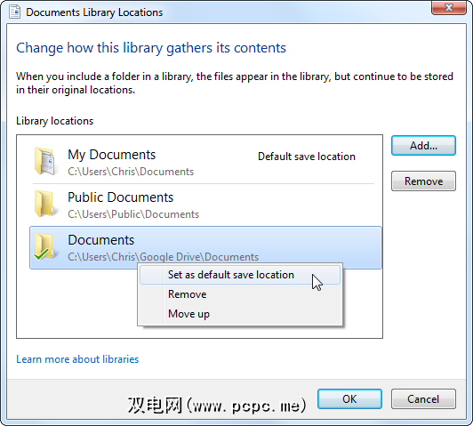 按默认情况下,库会将文件保存到传统的我的文档,我的图片,我的音乐和我的视频文件夹中。如果您想将文件保存到另一个位置(例如Dropbox文件夹或另一个云存储服务上的文件夹),则可以将该文件夹添加到库中,右键单击它,然后选择设置为默认保存位置。将文件保存到库时,它将被放置在您指定的文件夹中。这样可以轻松地将文件保存到云存储服务,而无需浏览任何文件夹。