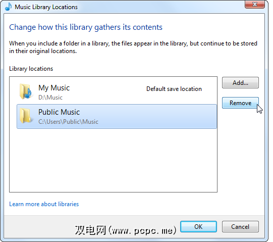 您还可以轻松地从库中删除文件夹。例如,如果您不想在个人库中看到示例音乐和视频文件,则可以从库中删除“公共音乐"或“公共视频"文件夹。