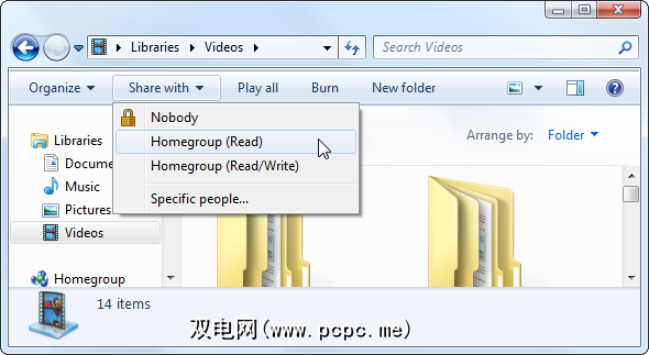 库与Windows Homegroup功能很好地集成在一起,使您可以轻松地在本地网络上共享文件。例如,如果所有视频文件都位于“视频"库中,则可以使用“共享方式"菜单,并轻松地与Homegroup上的所有其他计算机共享整个视频库。如果您将文件存储在不同硬盘上的多个位置中,这将特别方便,因为它使您可以在一个位置管理文件夹共享设置。