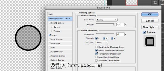 接下来,创建一个新层并隐藏所有其他层。在这个新图层上绘制一个圆。任何地方都可以,但不要太大。完成后,右键单击并选择混合选项,然后将“填充不透明度"更改为50%,然后添加一个8pt的黑色笔触。因此,您现在有了一个带有粗黑轮廓的灰色圆圈。