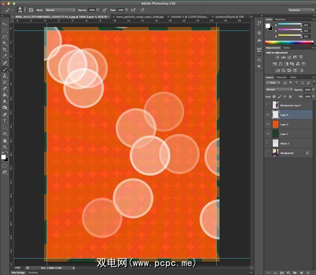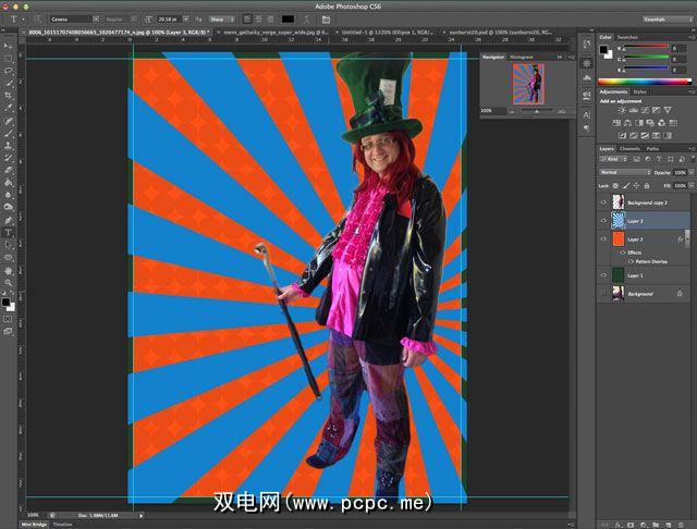 接下来,我使用的是fanextra.com 提供的免费的日晒图形(警告:我需要订阅一些邮件列表才能下载,但是那里有很多很棒的免费赠品,所以这是值得的)。 下载后,打开sunburst-20 PSD文件,用CMD-A选中所有文件,然后将其复制到原始文件的新层中,橙色背景上方。它的背景是透明的,但蓝色的效果不好。