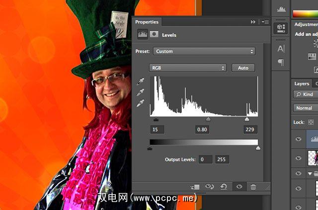 为下一个级别创建一个调整层(层->调整层->级别) ,并要求它使用上一层作为剪贴蒙版-这意味着效果只会应用于我们的模型。如果忘记了,可以随时右键单击该图层,然后从此处选择 Create Clipping Mask 。稍微拉动阴影和高光滑块,因此我们要删除一些色调范围。接下来,将中间调调一点。像这样: