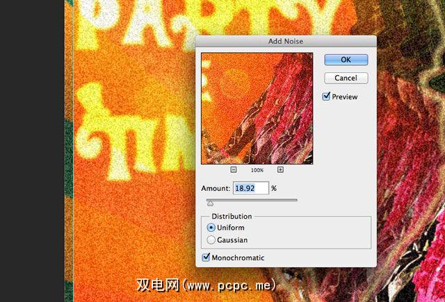 最后,要获得淡入淡出的复古效果,请通过按住Command键并单击(或按住Control键并单击)它们来突出显示所有以前的图层,然后按 Shift- Command-C (或Shift-Control-C)复制并合并并粘贴。您会发现已经创建了一个新图层,到目前为止您创建的所有内容都已合并到一个图层中。使用过滤器->噪声->添加噪点,均匀20%单色,然后将混合模式更改为屏幕并降低透明度(由您决定要多少)。