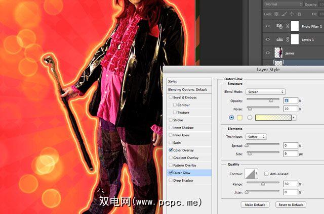 点击 fx 按钮,创建外发光,并以黄色覆盖颜色。最后,在该图层上应用2px的高斯模糊,这样您就可以在模型周围留下一个很酷的黄色光晕。很好。