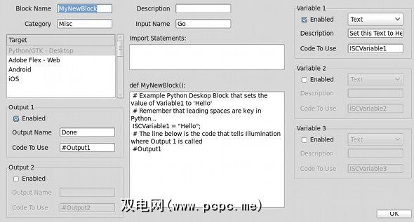 说到这点,以防万一Illumination Software Creator没有您要查找的特定功能,但知道实际的代码为此,您可以将其添加到“ 自定义块"中。在窗口中填写完信息后,您便可以准备该段代码以适合您的应用程序。