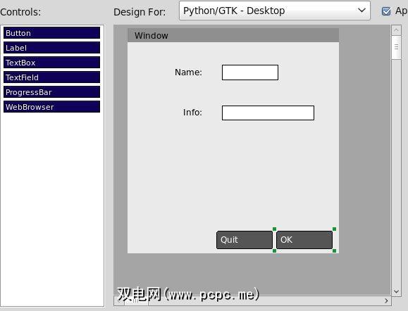 In order to have objects in your application window, you’ll need to “design” that window. That’s easy enough to do: just click on the window object and then on the “Design Window” button, and then drag objects from the left pane onto your application window. From there you can move around and resize your object, and in the right pane configure the name and label of that object. Once each object has been placed onto your application window, you can go back to the main window and start linking objects with actions when clicked.