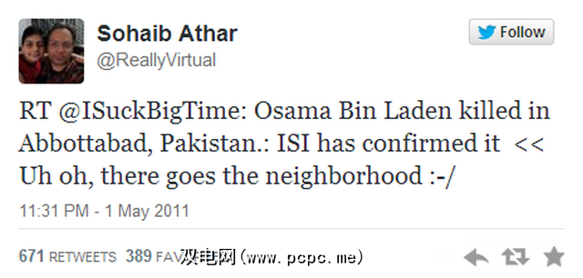 @ReallyVirtual – Sohaib Athar发推文Bin Laden Raid
