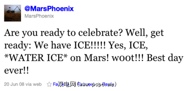 将来,如果在另一个星球上发现外星生命,它可能会首先在Twitter上宣布。由美国国家航空航天局提供。我怎么知道因为这正是凤凰号着陆器于2008年6月20日通过其@MarsPhoenix手柄宣布在火星上发现水的原因。