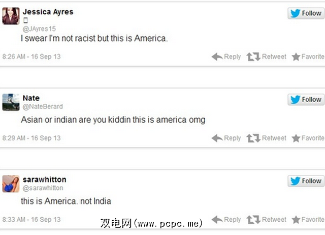 这些推文创建的情况暴露了社交网络的弱点,并且其向世界其他地区揭示特定文化最黑暗的弱点的能力。推特随后发表评论说,印度裔美国人和印度教徒纳娜·达武里(Nina Davuluri)获胜后,将她称为阿拉伯人,说她的获胜是9/11之后的耳光,还有各种无知和种族主义的推文