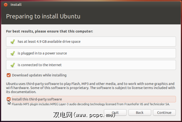 安装Ubuntu 在安装Ubuntu时,系统会询问您是否要安装某些第三方软件。该软件包包括Flash和编解码器,用于收听和观看各种常见的音乐和视频格式。除非您在意识形态上反对安装封闭源软件和受专利保护的编解码器,否则请务必安装此软件。