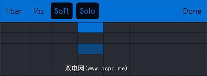 在每个模式的顶部,您都可以更改模式中的条形和网格的尺寸(对于特别精确的图案,请选择1/32)。按下 Soft 按钮以降低音符速度,而 Solo 可让您单独试听当前声部,而无需剩下歌曲。