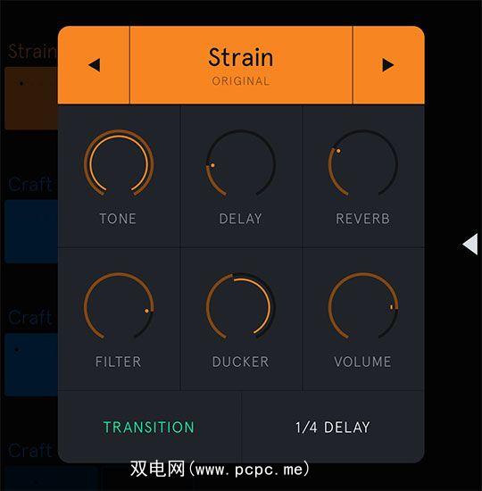 您可以通过点击来自定义每种乐器的声音它。使用 Transition (过渡)按钮来设置效果的起点和终点,例如缓慢的淡入淡出效果或使用低通滤波器削减高频。短的单杠场景可用于在歌曲中创建填充和中断,以使事情有点动摇。将它们与过渡效果结合使用可以产生一些有趣的效果。