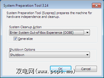 从此处,您需要在系统清理操作中选择输入系统开箱即用(OOBE) >下拉菜单,选中 Generalize 框,然后在其下方选择 Shutdown 。