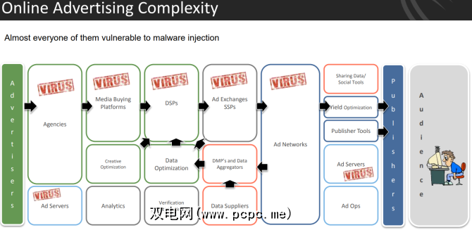 主要原因是广告无处不在。第三方广告网络将广告销售到eBay,天气频道,烂番茄和PCPC.me等大型网站。这意味着攻击者可以抓住机会。如果成功,其感染的广告将通过互联网广告网络的安全系统潜行。甚至像Google的DoubleClick这样受到高度信任的广告网络,也已经分发了恶意广告。