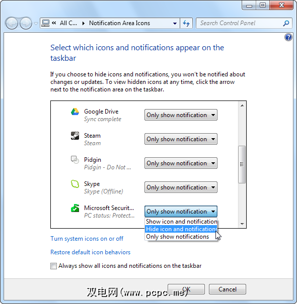 The Notification Area Icons control panel allows you to configure the behavior of each icon individually. Each icon has three available settings: