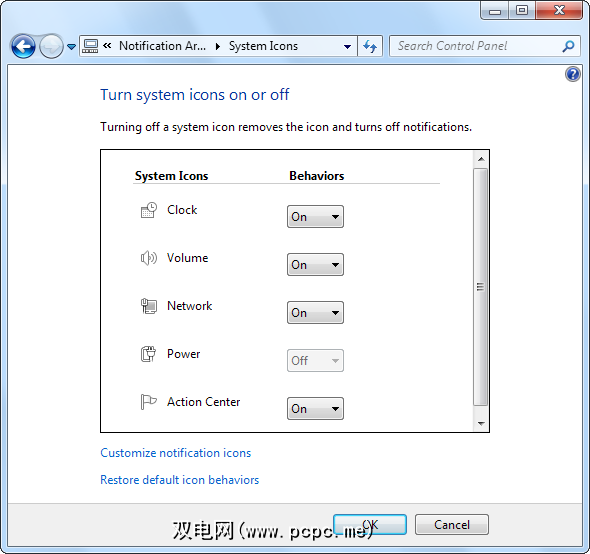 Windows包含一些自己的系统任务栏图标,称为“系统图标"。您可以通过单击来控制它们。通知区域图标窗口底部的打开或关闭系统图标链接。