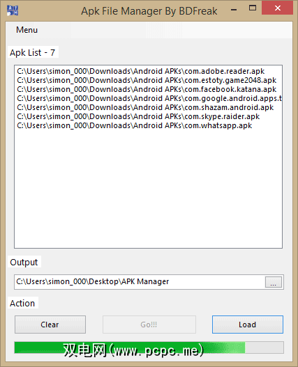 要开始使用,请启动APK文件管理器,然后按 Load 。导航至扫描APK并确认的位置。找到的APK将在主窗口中列出。选择一个输出文件夹(这将是新的,干净的APK库的位置),然后按一下有点过分的 Go !!! 按钮。
