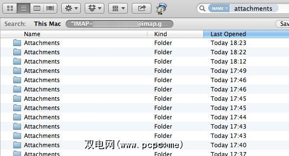 打开Finder应用程序,然后选择转到->转到文件夹。在文本字段中,输入 / Users / USERNAME / Library / Mail / V2 ,用“ USERNAME"代替您的用户名,然后按Go。打开与您的电子邮件地址关联的文件夹。在Finder窗口右上角的搜索字段中,输入“ 名称:附件",并确保Finder在您所在的文件夹中进行搜索,而不是在整个计算机中进行搜索(如