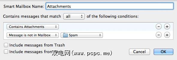 给智能邮箱起一个清晰的名称(允许您比“附件"更具创造力),从可用条件的下拉列表中选择“包含附件"。为避免垃圾邮件进入您的智能邮箱,您可以添加一个或多个其他“邮件不在邮箱中"条件。