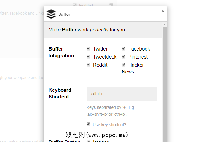 并非所有扩展程序都具有选项,但是通常可以对其进行自定义以更好地满足您的需求。例如,Buffer的选项包括用于社交媒体集成的选择选项: