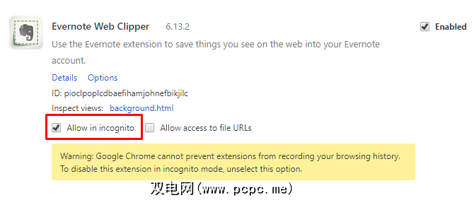 此页面上的另一个重要选项是允许隐身。默认情况下,在隐身模式下使用Chrome时不会加载扩展程序。如果您希望它们可用,只需选中扩展名下方的框: