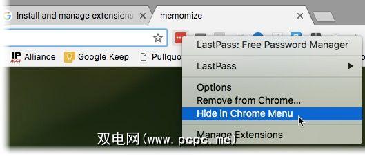 很高兴拥有您的扩展程序扩展程序易于访问。但是,并非每个添加到菜单栏的扩展名都必须存在。要隐藏Chrome扩展程序,请在菜单栏中右键单击它,然后选择隐藏在Chrome菜单中。
