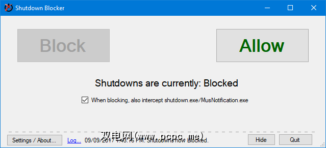 该程序具有直观的界面。只需单击阻止即可开始阻止用户触发的关机。如果要阻止由调用shutdown.exe的程序或Windows本身引起的故障,请勾选在阻止时也拦截shutdown.exe / MusNotification.exe 。