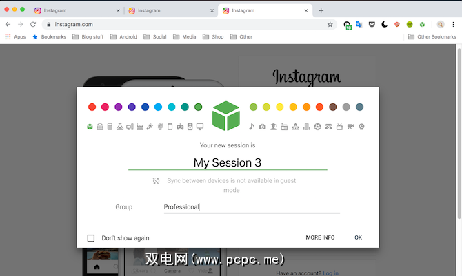 SessionBox无疑是功能最强大的。您可以根据需要启动任意数量的特定网站实例,对它们进行颜色编码或分组,或者如果您不希望向他们发送您的实际凭据,甚至可以与其他任何人共享这些会话。