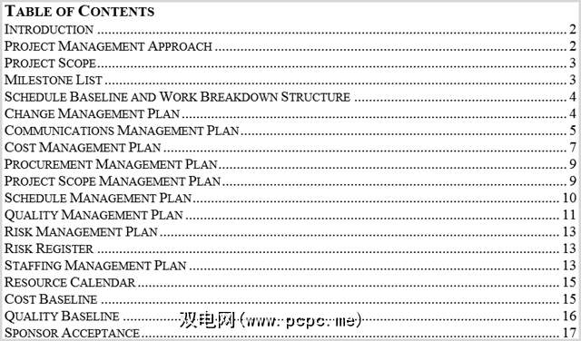 从项目目的开始,移至利益相关者,时间范围,方法,包容性以及以标志结尾-offs和文档控制,仅在两页上包含15个有用的部分。