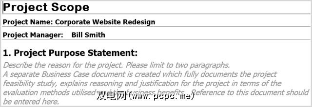 TidyForms也有一个简短的项目范围模板。本文档采用段落形式,当需要大量解释性细节时非常有用。