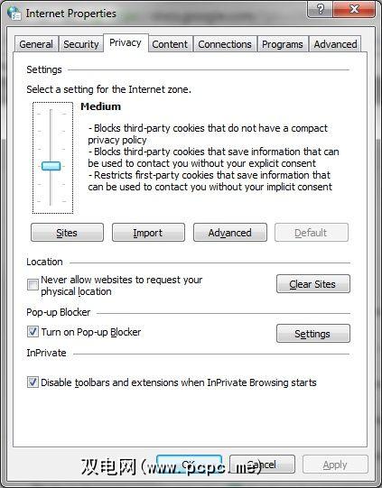 默认情况下,隐私设置为中。如果您不信任计算机用户行使个人和计算机安全性,我的建议是将隐私级别提高为“阻止所有Cookie"。这将使登录网站变得很麻烦,但同时也会阻止用户