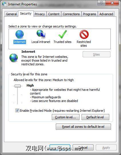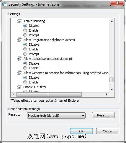 或者,您也可以将其切换为“ 高"设置,而实际上,这些设置的限制更大。上面的设置只是一个自定义选择,适合我的个人喜好(功能和安全性的结合),因此请选择。关键是,在公用PC上,您想要禁用可能的漏洞利用源-这就是上述设置/高设置的作用。