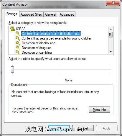 我已经在另一篇文章中介绍了Window的父母控件。但是,还有另一个内容控制功能,叫做 Content Advisor 。该工具位于家长控制按钮的正下方,您可以通过名为ICRA的组织根据网站的内容分级来限制网站。仅有的一个小问题– ICRA最近停止存在。当前所有的评分仍然可以使用,但是以后将不会更新。
