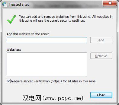 通过单击“安全性"选项卡中的绿色对勾图标打开“受信任的站点"。就像互联网一样,这里有一个用于安全性的滑块。如果您确实信任有问题的站点,则可以将安全性完全置于“低"状态,以最大程度地减少烦人的提示。要添加网站,请点击网站按钮,然后通过其网址进行添加。我建议您选中“ 需要服务器验证"选项,即使该选项有时会导致网站被标记为不受信任(这很重要–毕竟,黑客可能会伪造链接到您信任的网站)。