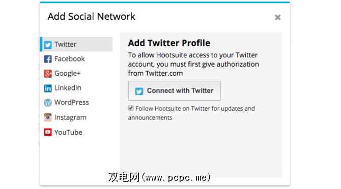 添加网络时,您必须输入Hootsuite有权访问这些配置文件上的提要。以我自己的帐户,我添加了三个配置文件(Twitter,LinkedIn和Google+),这是免费套餐的最大值。