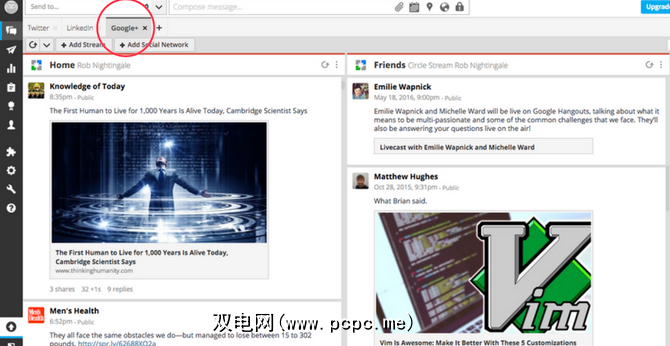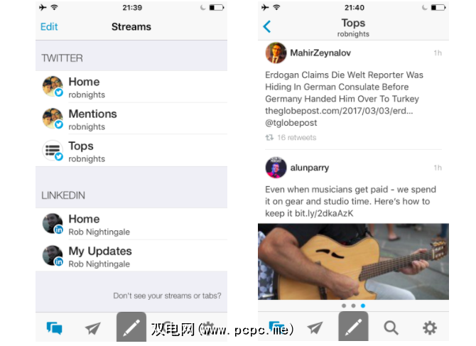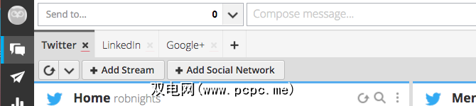 下面,您可以看到我在Twitter选项卡中添加了三个流:主页,显示了我的主要Twitter feed。 提及,其中显示了所有提及我的推文;和 Tops (Tops),这是我的Twitter列表之一的流。我还可以基于关键字和主题标签添加流。