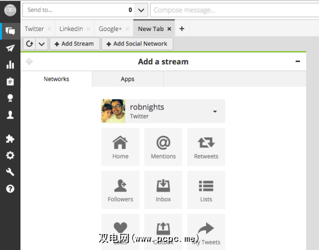 注册后要做的第一件事就是将您的配置文件连接到Hootsuite。要登录,请点击左上角的个人资料,然后点击添加社交网络。
