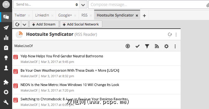 例如,在下面,您可以看到我已经安装了免费的Hootsuite Syndicator应用程序。这使我可以将RSS提要添加到我的Hootsuite帐户中,然后将其变成我自己的RSS阅读器。在该应用程序的免费版本上,我可以单击链接以在浏览器中打开内容。如果我付费升级应用程序,则可以选择将文章保存到Pocket,Evernote或其他应用程序中。