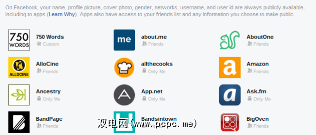 转到 Facebook设置>应用,您会看到所有已连接应用的列表。值得庆幸的是,Facebook明确了每个应用程序的隐私设置,因此您可以浏览列表,并将设置为“公开"或“朋友"的所有内容调整为不公开的内容。或者,您可以使用此视图删除您不认识或不想再使用的应用程序。