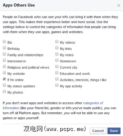 While you’re here, head to the “Apps Others Use” section and make sure your settings are as you’d wish. This tells Facebook how much information to share with the apps your friends install. So, consider the potentially dodgy apps that those acquaintances from work may have installed and check the boxes accordingly. As you can see, I think highly of my acquaintances and only allow their apps to see if I’m online or not. I figure that’s useful for communication, so it may as well stay.