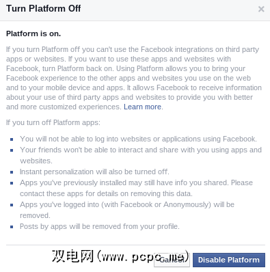 如果要禁用对第三方应用程序的使用,第三方应用程序完全登录,转到“应用程序,网站和插件",然后单击“编辑"并选择“禁用平台"。