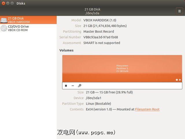 要启动磁盘实用程序,请打开通过单击左上角附近的 Ubuntu徽标,破折号。键入磁盘,然后单击磁盘。该实用程序的布局非常简单。您可以在左侧管理驱动器的列表。显示的其他所有内容均与当前选定的驱动器有关。