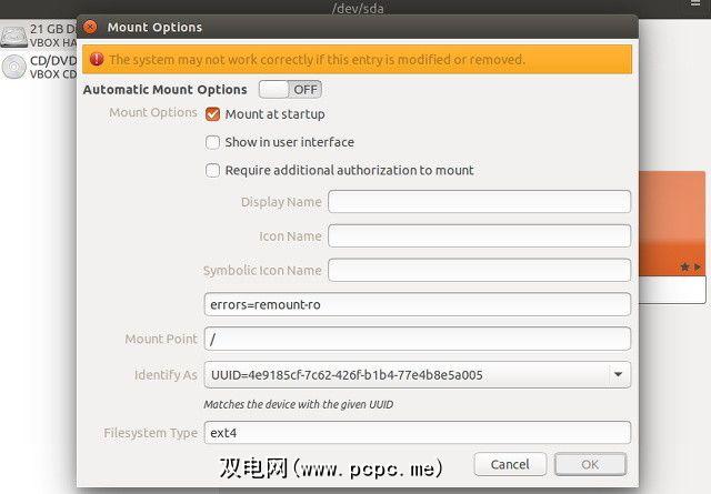 使用编辑挂载选项,您可以选择在引导过程中挂载文件系统,并根据需要进行其他更改。如果您要向系统中添加新的硬盘驱动器并希望将其自动挂载,则需要转到此处。
