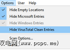 在打开Autoruns.exe程序之前,右键单击自动运行>以管理员身份运行。 ,这将消除讨厌的通知,要求您更改选项。程序打开后,转到选项,并确保隐藏Microsoft条目和隐藏Windows条目都已选中 。这两个选项将隐藏必要的系统文件,并限制对PC启动的可能损害。