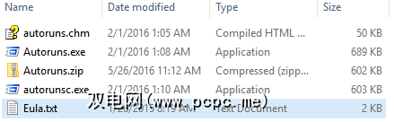 解压缩程序将显示多个项目。 自动运行是主程序,自动运行是命令行版本, autoruns.chm 描述了程序的功能,而 EULA.txt 文件告知您应谨慎处理此程序,以免损坏您的计算机。使用自动运行来查看,更改和删除PC上正在运行的文件。