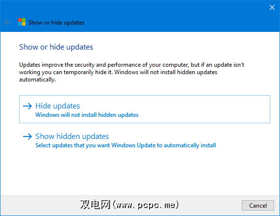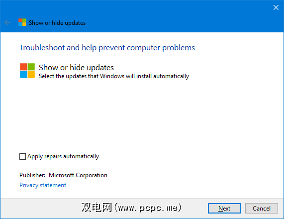 从Microsoft下载故障排除程序wushowhide.diagcab;该驱动程序使您可以隐藏驱动程序更新,从而阻止Windows重新安装它们。它是一个独立的应用程序,无需安装。在初始屏幕上,单击下一步。